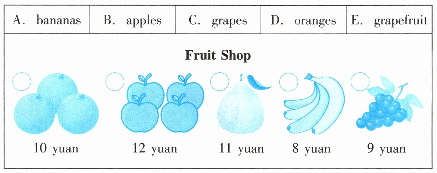 二、1. bananas 2. oranges 3. grapes4. eleven 5. twelve