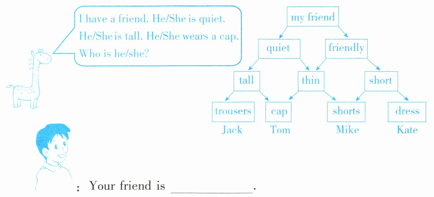 同学们,你们在学校一定有很多好朋友吧?你们的好朋友长什么样子,穿什么衣服呢?她/他们都有什么特征呢?长颈鹿也有好朋友,请你们根据长颈鹿的描述,找到它的好朋友吧!