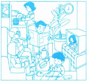 The old man is drinking tea. The man is reading a newspaper. The woman is cleaning. The girl is watching TV.