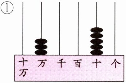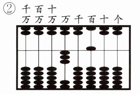 (3)在十万位上画2个珠子,千位上画5个珠子(注:此处根据题目所给插图信息,实际作答时应在对应的数位下方画出相应数量的珠子,由于文本限制,以文字描述代替)