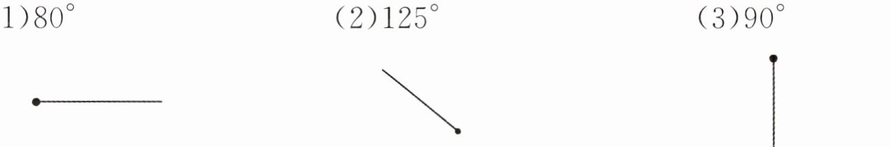 步骤:把量角器中心对准射线端点,0°刻度线与射线重合,找到125°刻度线处点一个点,以射线端点为端点,过此点画射线,构成125°角。