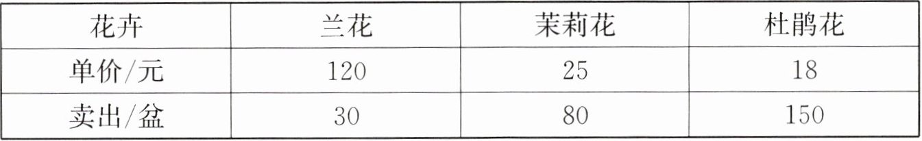 (1)兰花卖了3600元,茉莉花卖了2000元,杜鹃花卖了2700元;