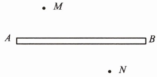 4. 一辆汽车在笔直的公路上由点 $ A $ 向点 $ B $ 行驶,$ M $、$ N $ 分别是位于公路两侧的两所学校,如右图所示。汽车在公路上行驶时,噪声会对这两所学校的教学带来影响。当这辆汽车行驶到何处时,分别对这两所学校的影响最大?请在图上标出来。