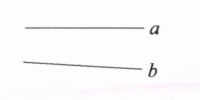 使用直尺(或三角板)紧贴一条直线,使其与另一条直线相靠,可观察到两条直线与直尺(或三角板)的夹角不同,所以直线$a$与$b$不是互相平行的。
