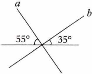 理由:因为$180^{\circ}-55^{\circ}-35^{\circ}=90^{\circ}$,即直线$a$与直线$b$相交所成的角为$90^{\circ}$,根据垂直的定义:如果两条直线相交成直角,就说这两条直线互相垂直,所以直线$a$与直线$b$互相垂直。