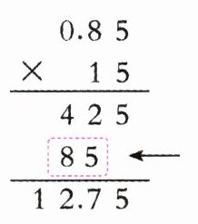 乐乐冲洗 15 张照片,每张照片的冲洗费是 0.85 元,乐乐笔算如右图所示,虚线框里箭头所指的“85”表示(