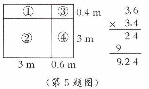 5. 小丽的房间是个长 $3.6$ 米、宽 $3.4$ 米的长方形(如上图),她按照上图这样的竖式计算,少算了(