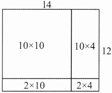 4. 数学家华罗庚说过:数形结合百般好。数形结合是非常重要的数学思想方法。我们可以用画图的方法帮助计算乘法。比如,计算$14×12$时,用长方形分成四部分来计算(示意图如下)。请用同样的方法计算$3.8×1.4$。(提示:把小数拆分成整数部分和小数部分)