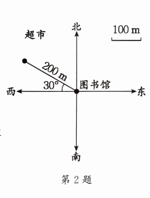 2. 超市在图书馆的()偏()()方向上,距离是()米。