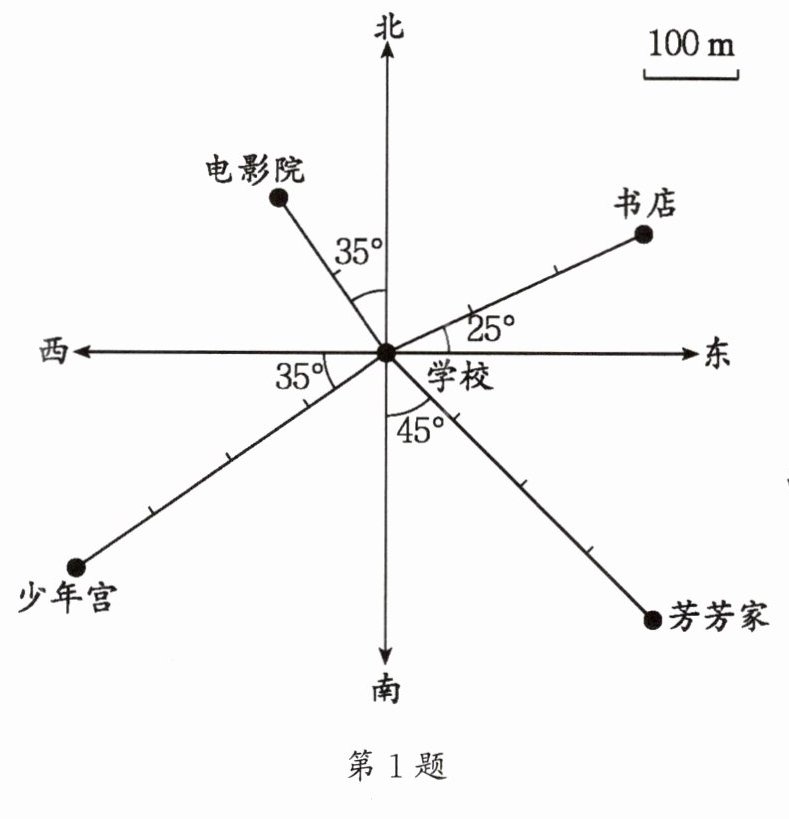 (1)芳芳家在学校()偏()()方向上,距离()米。