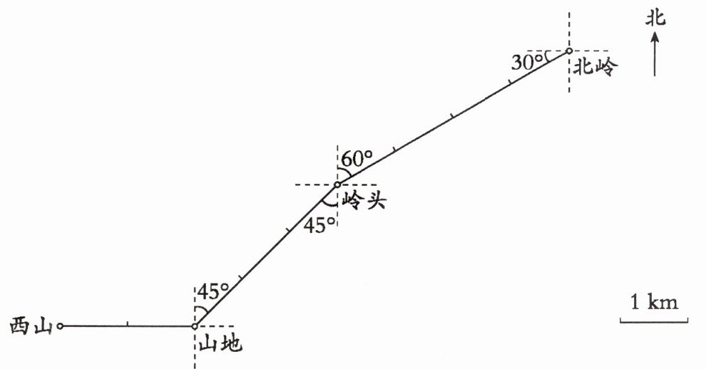 (1)李大伯从西山出发去北岭,他要先向方向走km到山地,再向偏方向走km到岭头,然后向偏方向走km到达北岭;他从北岭返回西山时,要先向偏方向走km到岭头,再向偏方向走km到山地,最后向方向走km回到西山。