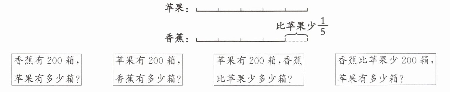 苹果有200箱,香蕉比苹果少多少箱?——200×1/5