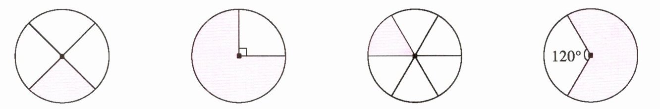 3. 下列涂色部分扇形的圆心角各是多少度?填一填。