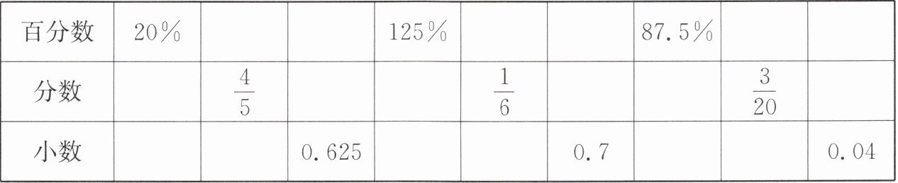 百分数: 20%, $\frac{1}{5}$, 0.2;