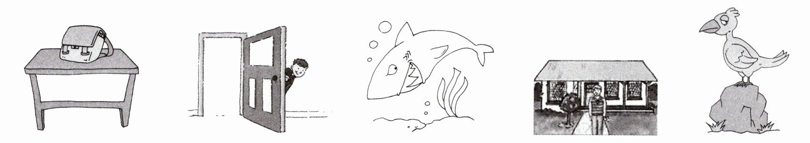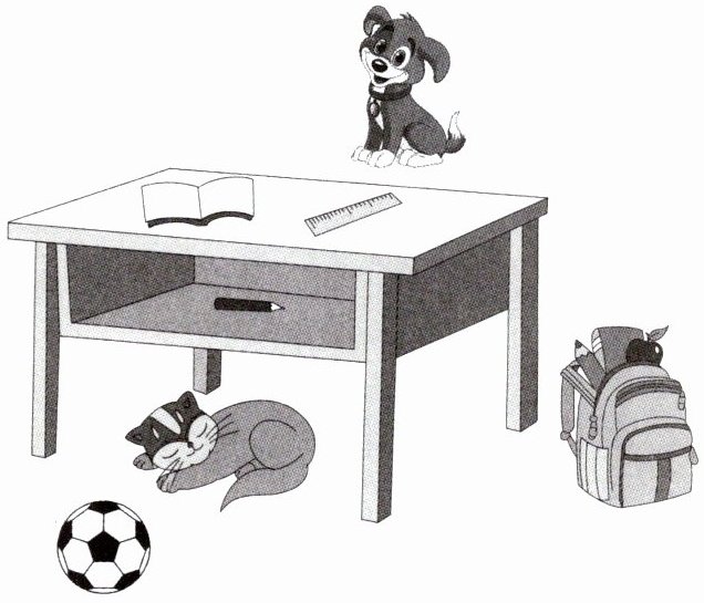 The cat is 1. ______ the desk. The ruler is 2. ______ the desk. The pencil is 3. ______ the desk. The apple is 4. ______ the bag. The book is 5. ______ the desk. The dog is 6. ______ the desk. The football is 7. ______ the desk.