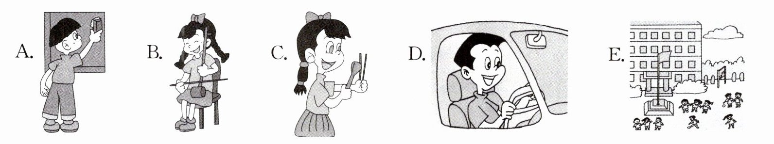 四、读一读,根据图片用 on,in,under,behind,in front of 填空。