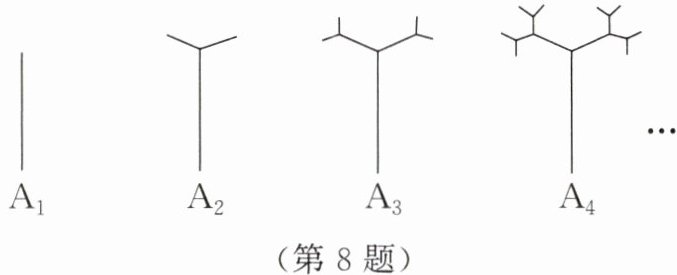 8. 如图所示的是按照一定规律画出的“树形图”,经观察可以发现:图 $A_2$ 比图 $A_1$ 多出 $2$ 个“树枝”,图 $A_3$ 比图 $A_2$ 多出 $4$ 个“树枝”,图 $A_4$ 比图 $A_3$ 多出 $8$ 个“树枝”……照此规律,图 $A_6$ 比图 $A_2$ 多出的“树枝”个数为(