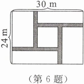 6. 张伯伯准备在一块长 $ 30 $ m、宽 $ 24 $ m 的矩形花圃内修建四条宽度相等,且与各边垂直的小路(如图阴影部分所示). 四条小路围成的中间部分恰好是一个正方形,且边长是小路宽度的 $ 4 $ 倍. 若四条小路所占面积为 $ 80 $ m^2,则小路的宽度为