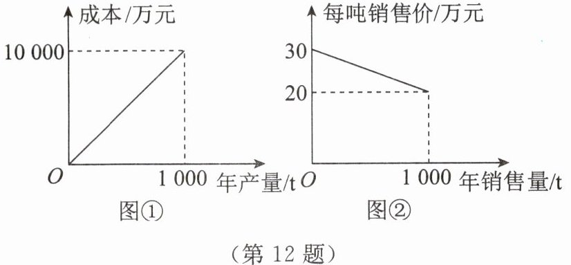 12. 某种产品的年产量不超过 $ 1000 $ t,该产品的年产量 $ x $(t)与成本(万元)之间的函数关系如图①所示;该产品的年销售量(t)与每吨销售价(万元)之间的函数关系如图②所示.