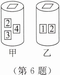 6. 如图,甲、乙是两个不透明的圆桶,甲桶内的三张牌分别标记数字 2,3,4;乙桶内的两张牌分别标记数字 1,2(这些牌除所标数字不同外,其余均相同). 若小宇从甲、乙两个圆桶中各随机抽出一张牌,则其数字之和大于 4 的概率是