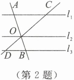 2. 如图,$l_{1} // l_{2} // l_{3}$,直线 $AB$,$CD$ 与 $l_{1}$,$l_{2}$,$l_{3}$ 分别相交于点 $A$,$O$,$B$ 和点 $C$,$O$,$D$。若 $\frac{AO}{BO} = \frac{3}{2}$,$CD = 6$,则 $CO$ 的长是(