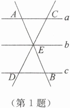 1. 如图,已知 $a // b // c$,直线 $AB$ 与 $a$,$b$,$c$ 分别交于点 $A$,$E$,$B$,直线 $CD$ 与 $a$,$b$,$c$ 分别交于点 $C$,$E$,$D$。若 $AE = EB$,则下列结论一定成立的是(
