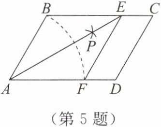 5. 如图,在$□ ABCD$中,以点$A$为圆心,$AB$长为半径画弧,交$AD于点F$,再分别以点$B$,$F$为圆心,大于$\frac{1}{2}BF$的相同长为半径画弧,两弧交于点$P$. 连接$AP并延长交BC于点E$,连接$EF$.