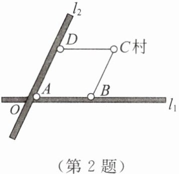 2. 如图,两条笔直的公路$l_{1}$,$l_{2}$相交,$C村的村民在公路的旁边建了三个加工厂A$,$B$,$D$.其中加工厂$A位于l_{1}$,$l_{2}交点O$处,已知$AB = BC = CD = DA = 5\mathrm{km}$,$C村到公路l_{1}的距离为4\mathrm{km}$,则$C村到公路l_{2}$的距离为