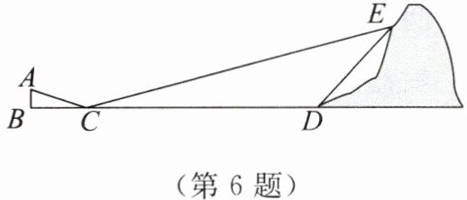 6. 如图,小华和同伴发现在某地小山坡的点 $ E $ 处有一棵小桃树,他们想利用皮尺、测倾器和平面镜测量小桃树到山脚下的距离(即 $ DE $ 的长度). 小华站在点 $ B $ 处,让同伴移动平面镜至点 $ C $ 处,此时小华在平面镜内可以看到点 $ E $,且测得 $ BC = 6 \, m $,$ CD = 24 \, m $,$ \angle CDE = 135° $,已知小华的身高 $ AB = 1.5 \, m $. 请根据以上数据求 $ DE $ 的长度(结果保留根号).