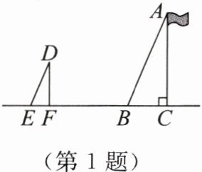 1. 如图,某一时刻,一根长为 $ 1.6 \, m $ 的标杆 $ DF $ 在阳光下的影长 $ EF $ 的长度为 $ 0.4 \, m $,同一时刻同一地点测得某旗杆的影长 $ BC $ 的长度为 $ 5 \, m $,则该旗杆 $ AC $ 的高度为(