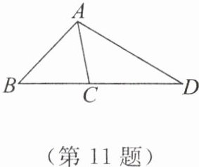 11. 如图,在 $ \triangle ABC $ 中, $ AB = 8 $, $ AC = 6 $, $ AD = 12 $,点 $ D $ 在 $ BC $ 的延长线上,且 $ \triangle ACD \sim \triangle BAD $,求 $ BD $ 的长。