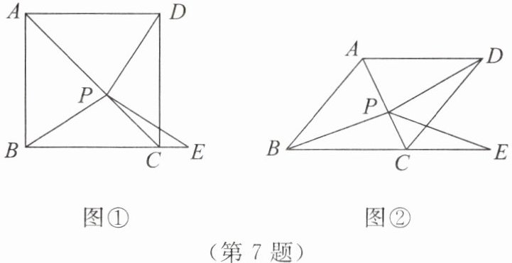 7. 如图①,在正方形 ABCD 中,点 P 是对角线AC 上一点,连接 PB,PD,点 E 在 BC 的延长线上,且 PE= PB.