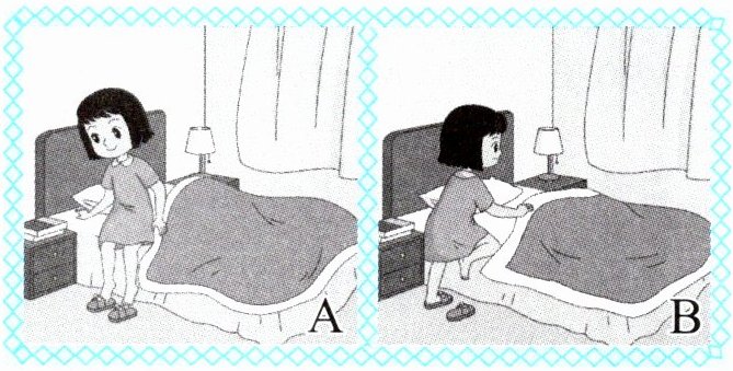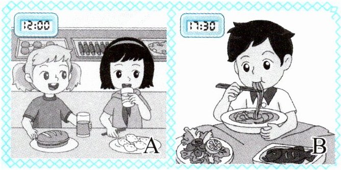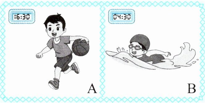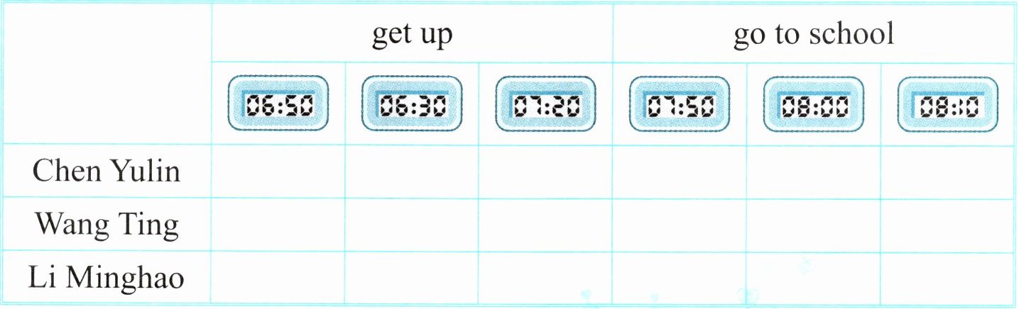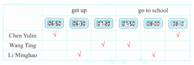Ⅲ.李华正在了解三个小伙伴起床和上学的时间,请根据他们的对话,在相应的时间下方画“√”。