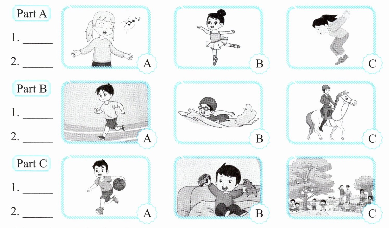 Part A: 1. B 2. A Part B: 1. C 2. B Part C: 1. B 2. C