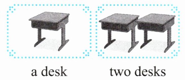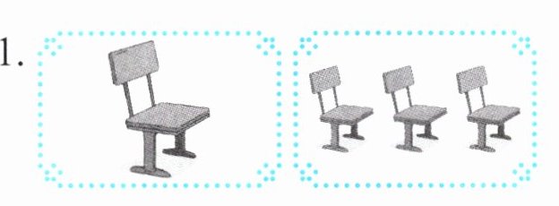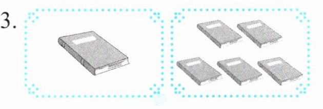 1. a chair, three chairs 2. a window, two windows 3. a book, five books