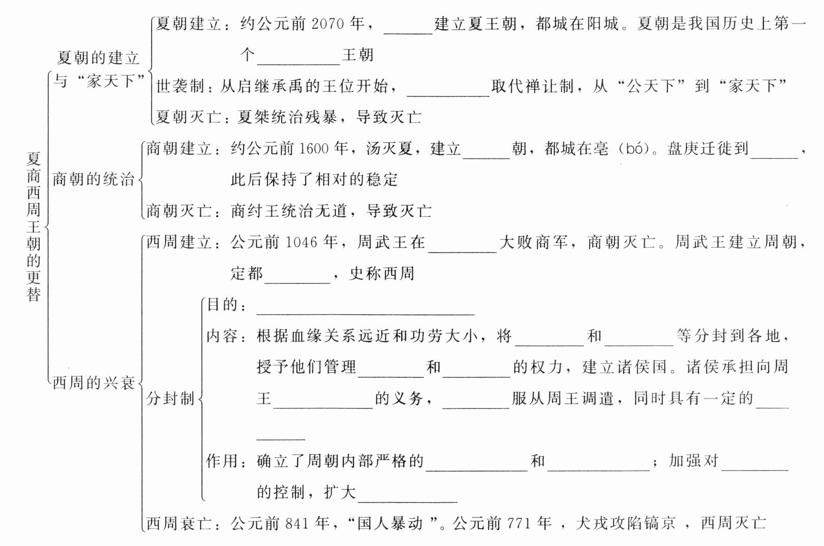 |禹建立( )朝|( )灭夏|( )建立|“国人暴动”|西周灭亡|