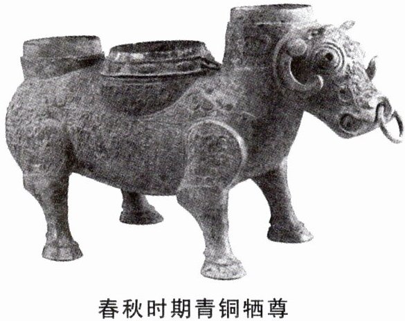 右图所示为春秋时期青铜牺尊。这是一件春秋晚期的青铜酒器,高 33.7 厘米,长 58.7 厘米,重 10.76 千克,现收藏于上海博物馆。该尊的腹部中空,颈及脊背上有三穴,中间一穴套有一只锅形的器皿,可以自由取出,用于盛酒,前后两个空穴用于灌注热水,用于温酒。牛首、颈、身、腿等部位饰有以盘绕回旋的龙蛇纹组成的兽面纹,即兽面衔两蟠龙,蟠龙的上半身从兽面的头顶伸出,下半身被兽面的双角钩住并向两边延伸。在牛颈及锅形器上饰有虎、犀牛等动物的浮雕,形态生动,铸造精美。牺尊的牛鼻上还穿有一个铜环。