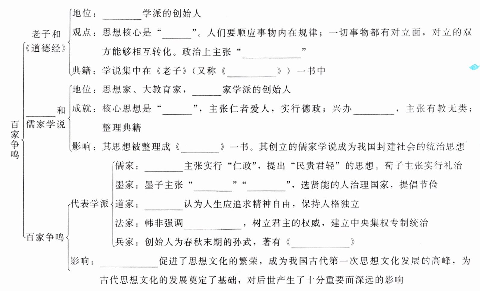 | 百家争鸣 | ______和儒家学说 | 地位:思想家、大教育家,______家学派的创始人 |