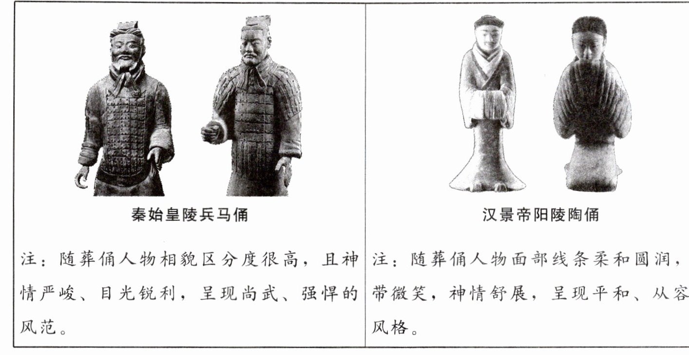 (3)风格:秦始皇陵兵马俑:雄浑大气、壮观威严;汉景帝阳陵陶俑:平和从容、面带微笑。社会风貌:社会稳定,人民安居乐业。