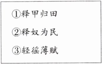 (2)措施:罢兵归家、释放奴婢、劝农桑。理念:休养生息。