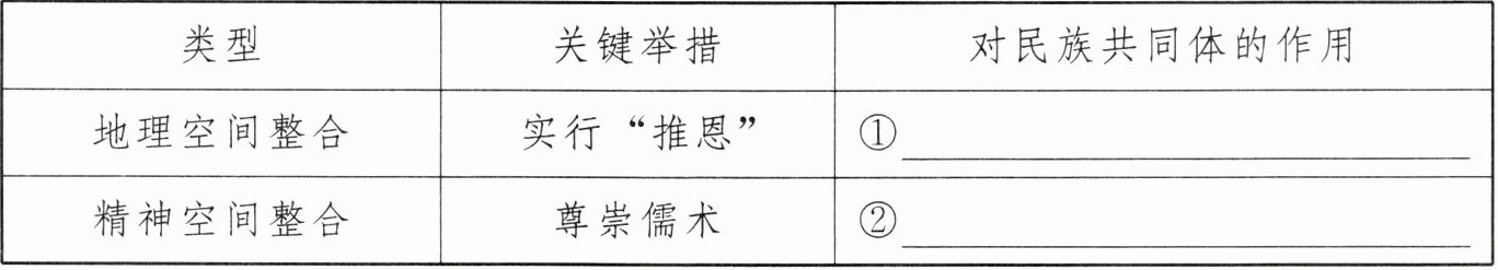 根据材料并结合所学知识,完成下列填空,分析汉武帝完成“从地理空间到精神空间的整合”举措的作用。