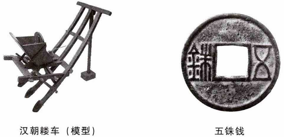 (1)类型:实物史料。 史实:注重发展农业生产,发明新型播种工具耧车;把铸币权收归中央,统一铸造五铢钱。