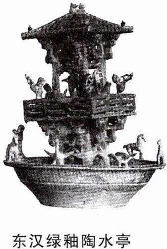 右图所示为东汉绿釉陶水亭,通高54.5厘米,通体施绿釉,1951年于陕西西安新筑镇出土。它陈列在中国国家博物馆《古代中国》展厅,是一件国宝级陶器。亭分两层,置于圆形水池内;亭脊顶与檐角均塑有禽鸟;中层四角各有一名张弩控弦的武士守卫,亭中有一人扬袖起舞,旁有一人抚琴,三人拍手伴歌;下层有楼梯;水池周围塑有人、马、鹅等形象。