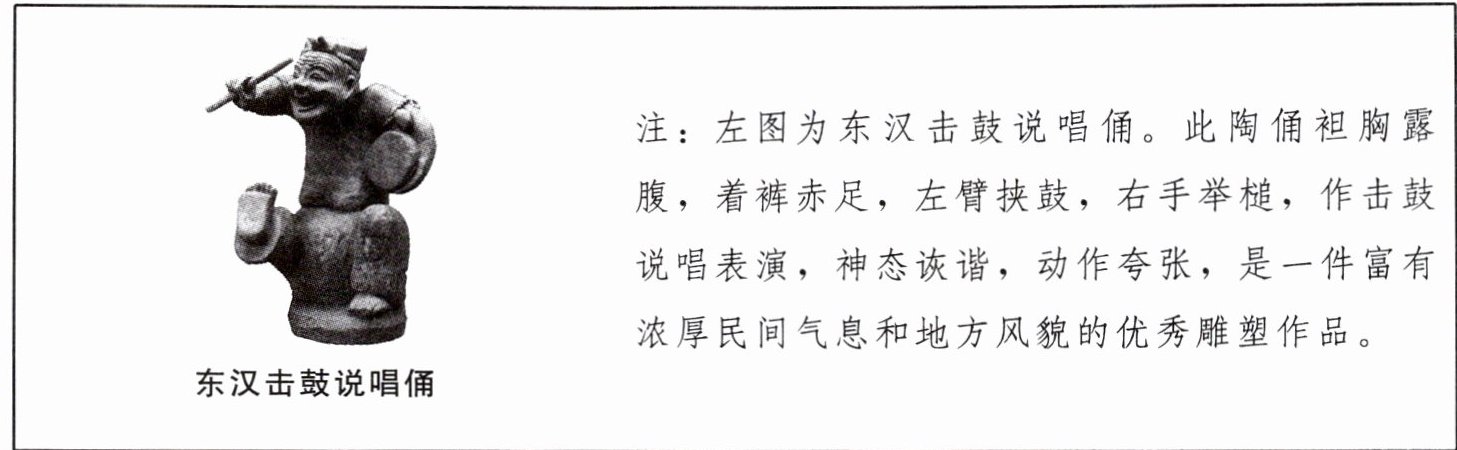 注:左图为东汉击鼓说唱俑。此陶俑袒胸露腹,着裤赤足,左臂挟鼓,右手举槌,作击鼓说唱表演,神态诙谐,动作夸张,是一件富有浓厚民间气息和地方风貌的优秀雕塑作品。