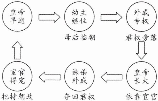 皇帝早逝→幼主继位→外戚专权,母后临朝,君权旁落→皇帝长大,依靠宦官,诛杀外戚,夺回君权→宦官得宠,把持朝政