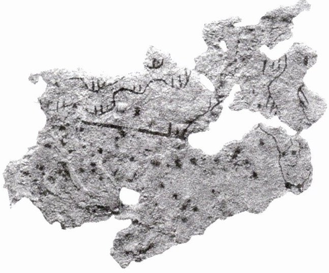 右图所示为天水放马滩汉墓出土的西汉纸地图。这幅西汉初期的纸质地图残块长5.6厘米、宽2.6厘米,1986年出土于甘肃省天水市东南放马滩5号墓。出土时纸呈黄色,现褪变为浅灰间黄色,表面有污点。图面线条清晰,上面有用细黑线条绘制的道路、山脉、河流、沟溪和关隘等图形,并标有各处地名。