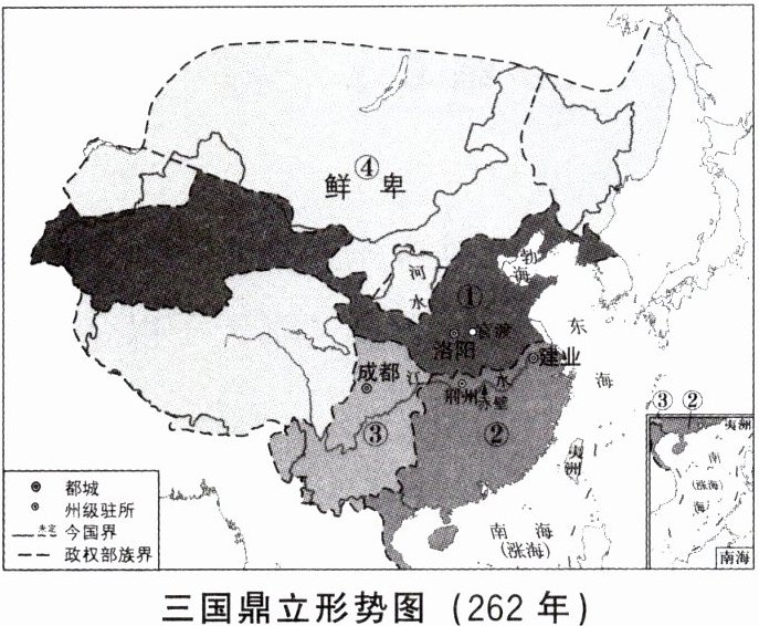 6. 历史地图是学习历史、分析历史、理解历史的重要工具。仔细观察右图,其中代表“曹魏”政权区域的是(