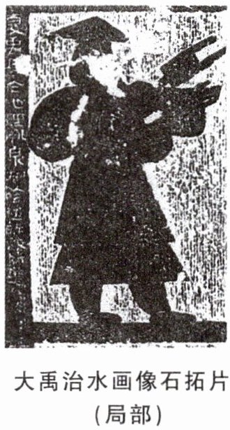 下图所示大禹治水画像石拓片(局部)取自山东嘉祥武氏祠的画像石。画像中,禹戴斗笠,身穿直裾短袍,右手执臿,左手做招呼状,似乎正在指挥部落成员进行治水工程的挖掘。大禹以十分原始的工具,带领大家克服重重困难,用10多年的时间完成了治水的重任。他治水期间“三过其门而不入”,被后世传为美谈。禹以治水有功,受到民众爱戴,被尊称为“大禹”。