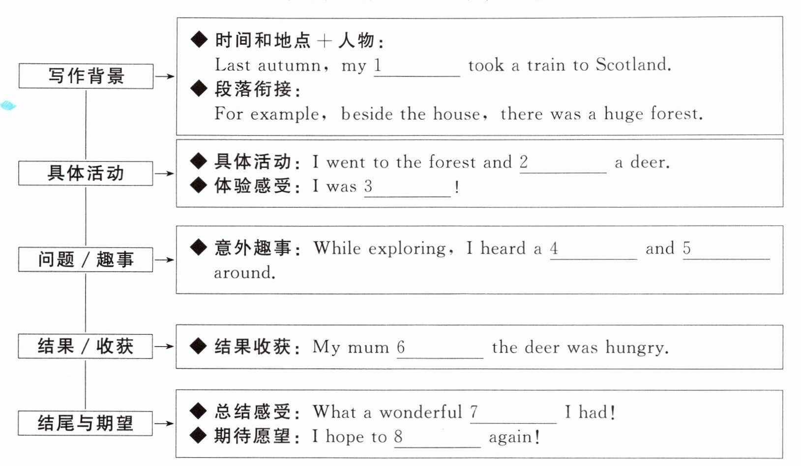 (D) Last autumn, my family took a train to Scotland. The scenery along the way was so beautiful. For example, beside the house we stayed in, there was a huge forest. I went to the forest and explored it. While exploring, I heard a noise and turned around. I was surprised to see a deer! My mum thought the deer was hungry. What a wonderful experience I had! I hope to visit Scotland again!