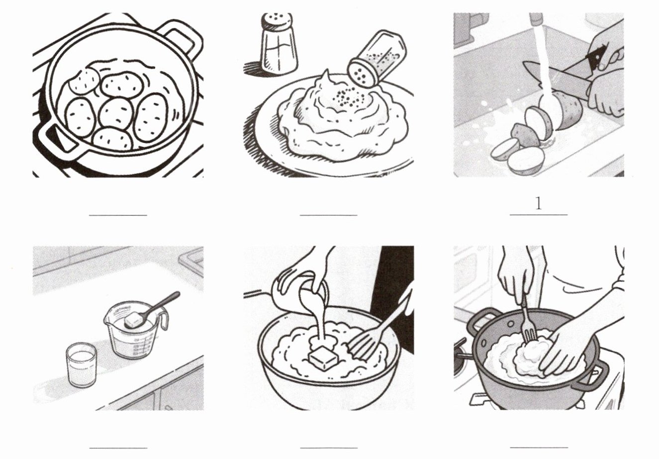1.Six 2. tablespoon 3. half 4.wash 5.put 6.boil 7.mashing 8. add 9. mix 10.pepper